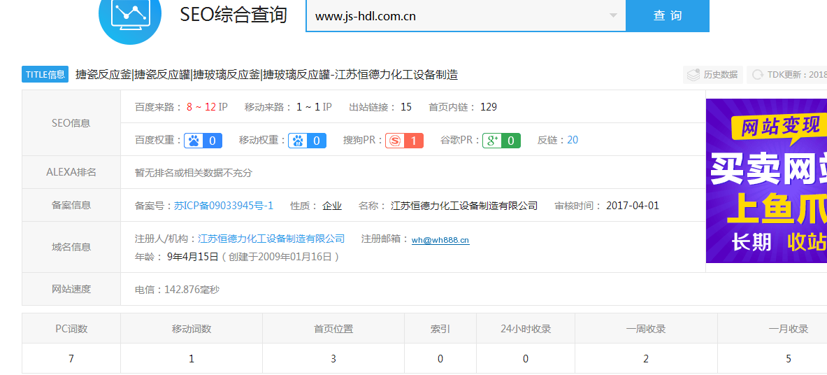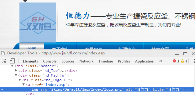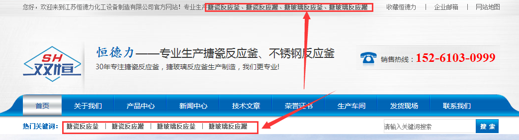 网站logo标签的设置不正确,我们正确的做法是把你公司名称跟要做的关键词融合进去写进alt标签中,我们写为:江苏恒德力搪瓷反应釜制造公司这样才是正确的,而我们也顺便在logo上增加H1标签的注释增加该标签中的关键词重要性。